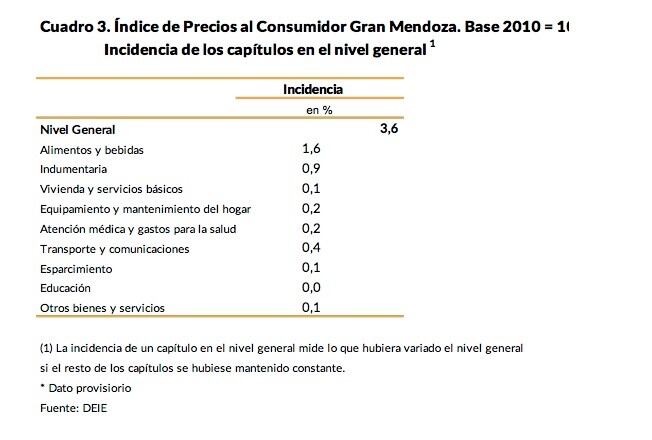 La Dirección de Estadísticas e Investigaciones Económicas informó que el nivel general del Índice de Precios al Consumidor (IPC) para el gran Mendoza fue del 3,6%, el mayor de lo que va del año.