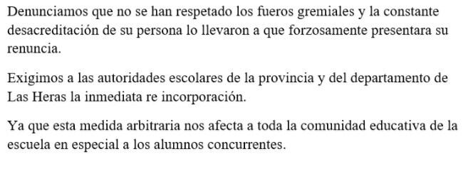 Egresados y estudiantes se reunieron a las 13 y leyeron un comunicado en el que aseguraron que Merenda “siempre ha sido un profesor y director accesible, compresivo de la situación de cada alumno que necesitaba ayuda”.