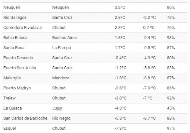 Así está el ranking de las temperaturas más bajas de Argentina:
