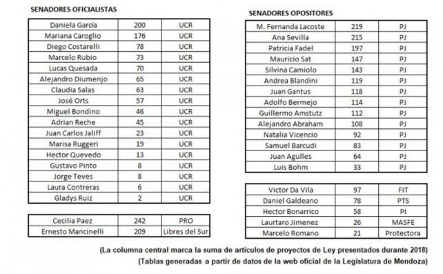 El informe sobre la productividad de los senadores mendocinos, elaborado Zeta Consultores, reveló que Cecilia Paez del PRO, fue quien más proyectos presentó durante 2018, con un total de 242. Mientras que la menos productiva fue Gladys Ruiz, de la UCR, con solo dos.