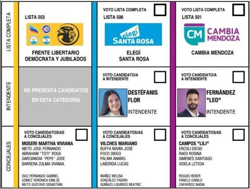 - Los ciudadanos de Santa Rosa verán opciones en la boleta únia, pero sólo dosn candidatos a intendentes. En esta comuna la figura de la actual jefa de gobierno Florencia Distéfanis es muy fuerte y en las pasadas PASO lo dejó claro: superó el 52% de los votos y dejó atrás a Leo Fernández, de Cambia Mendoza con quien dirimirán el puesto este domingo.