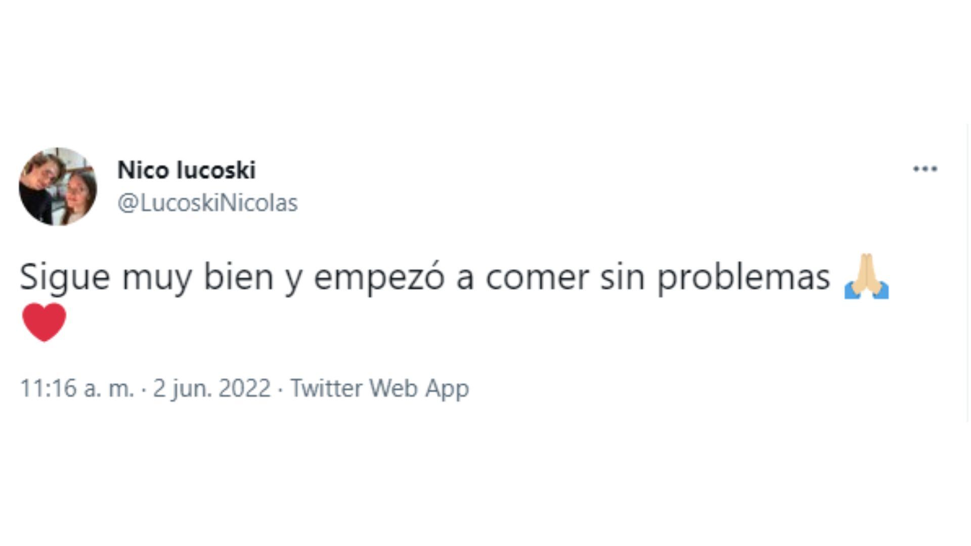 El vocero de los Lucoski, Nicolás, ha ido contando la evolución de la lujanina. Por medio de sus publicaciones en Twitter muchos mendocinos se enteraron de las operaciones que tuvo, de la vez que despertó y cuando logró reconocerlos.
