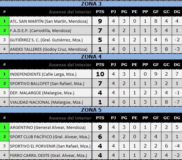 Zona 5: Ferro CO (Gral. Alvear) 0, Sp. El Porvenir (San Rafael) 1; Sp. Club Pacífico (Gral. Alvear) 1, Argentino (General Alvear) 2. Próxima fecha, mañana martes 7: Sp. El Porvenir vs. SC Pacífico y Sp. Argentino vs. Ferro CO.