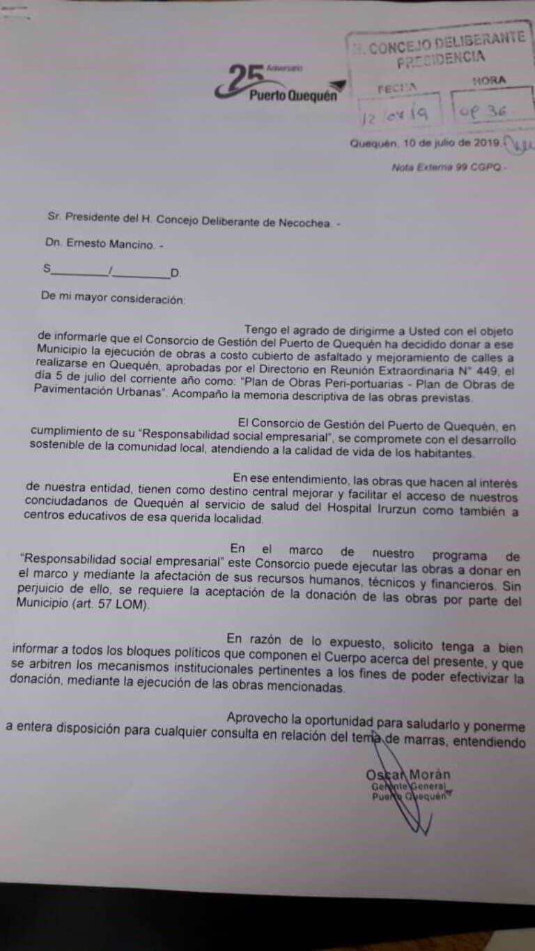 El anuncio del Consorcio de Gestión de Puerto Quequén fue oficializado por Arturo Rojas, la donación de la ejecución del Plan de Obras de Pavimentación Urbana, a costo cubierto, de los accesos al Hospital, escuelas y jardines de infantes de Quequén.