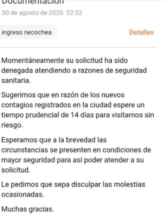 "Pedí el permiso a la Municipalidad, y me lo negaron. Pero no me explicaron por qué. Me contestaron con pocas palabras, pero quedó claro que desestimaron mi pedido", detalló María y por la forma en la que está redactado el mail que recibió sospecha de que se trata de una respuesta automática, por lo que su caso no estaría siendo evaluado.