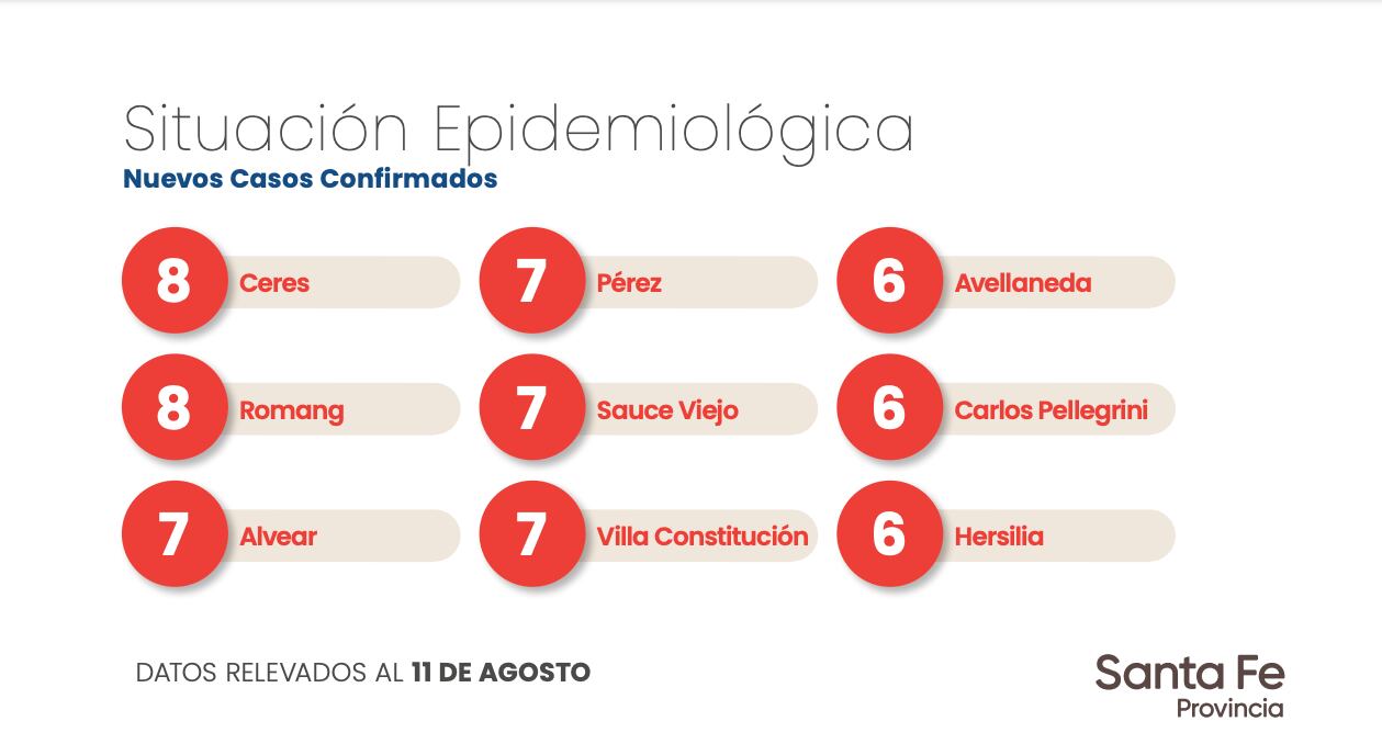 Otras localidades que sumaron varios casos son: 24 Firmat, 22 Esperanza, 19 Arequito y Rufino, 16 VGG y 14 San José de la Esquina.