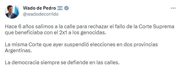Aunque todavía no se dieron detalles del acto, el ministro del Interior, “Wado” de Pedro, recordó en sus redes: “Hace seis años salimos a la calle para rechazar el fallo de la Corte Suprema que beneficiaba con el 2x1 a los genocidas. Es la misma Corte que ayer suspendió elecciones en dos provincias argentinas”.