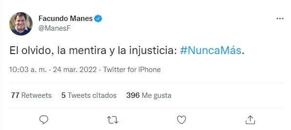 El diputado Florencio Randazzo pidió “recordar que los Derechos Humanos son de todos y todas, y están por encima de cualquier espacio político”. Mienstras que el referente de la UCR, Facundo Manes aseguró: “El olvido, la mentira y la injusticia: #NuncaMás”.