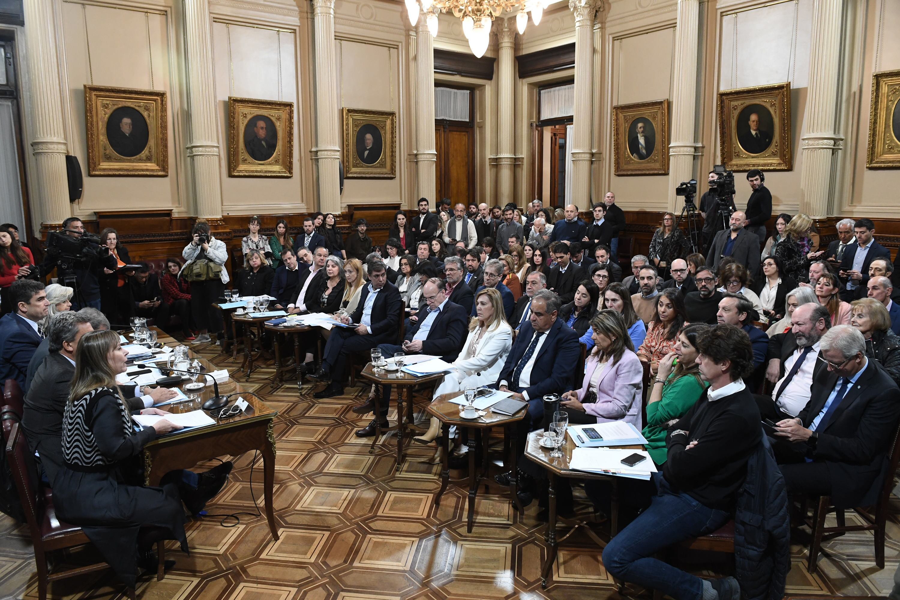 Ubicados en la cabecera del salón, los senadores Luis Naidenoff, Carolina Losada, Mariana Juri y Edith Terenzi aclararon que la solución no depende solo de Juntos por el Cambio, porque no tiene mayoría en el Senado.