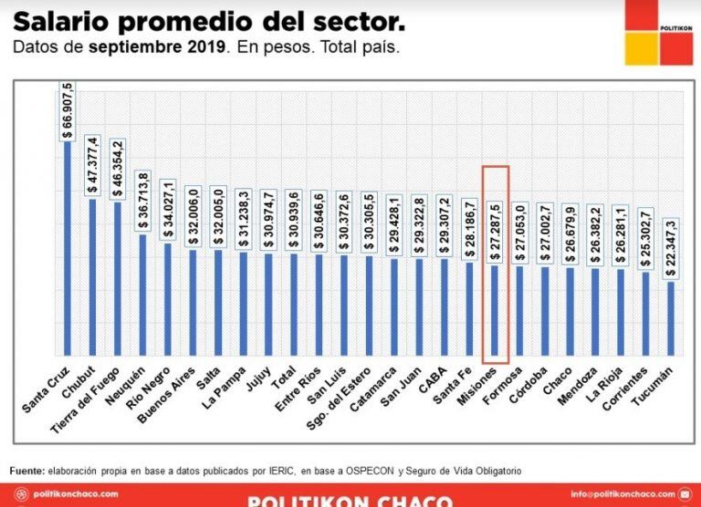 En lo que refiere a las provincias del NEA, Misiones tiene el valor nominal de salario promedio más alto ($27.287), seguido de Formosa ($27.053), Chaco ($26.679) y Corrientes el más bajo ($25.302). En todos estos casos, el salario promedio de septiembre cayó respecto al de agosto.