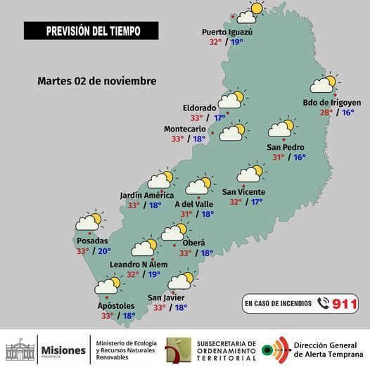 Las temperaturas estimadas para hoy en zona norte serán de 32°C de máxima y 19°C de mínima; en zona sur, la máxima estará en 33°C y la mínima en 18°C. En Posadas, la temperatura mínima será de 20°C mientras que la máxima alcanzará los 33°C.