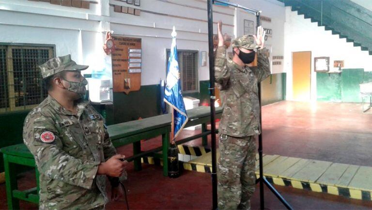 El Grupo de Protección Química, Bacteriológica, Radiológica y Nuclear (QBRN) construyó arcos y cabinas de desinfección que se emplean en lugares de alto tránsito peatonal y cumplen la función de eliminar gran parte de la carga viral que pueda tener una persona en sus prendas de vestir, reduciendo así la posibilidad de propagación.