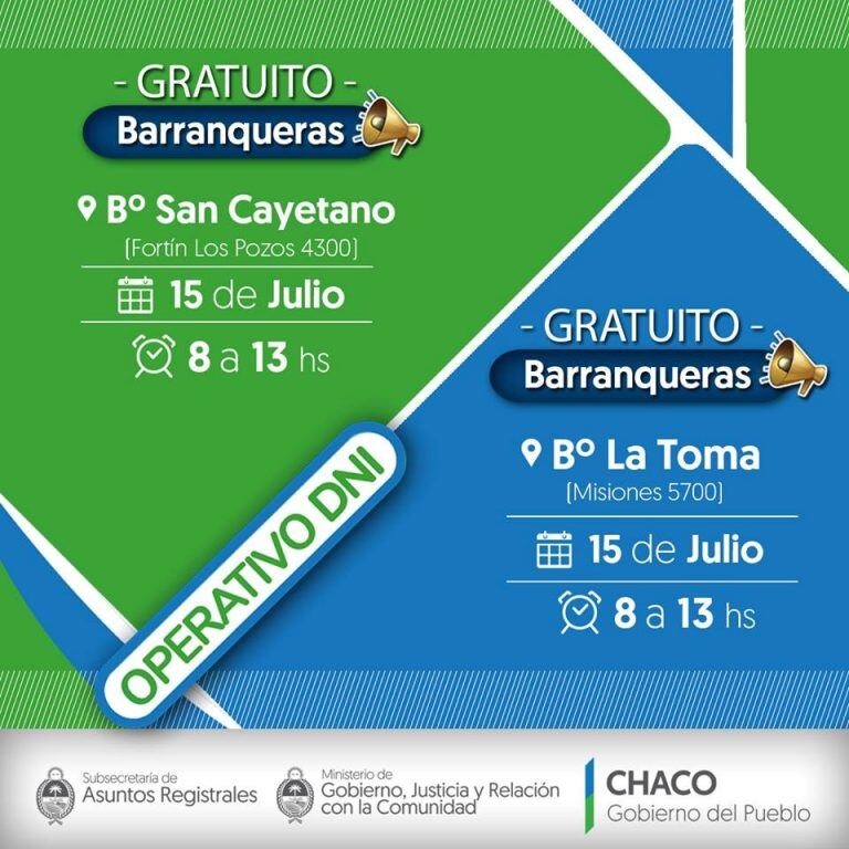 Esta semana, la Subsecretaría de Asuntos Registrales y de la Dirección General del Registro Civil, organizaron operativos en Barranqueras: Este lunes, se atenderá hasta las 13, en calle Misiones al 5700 en barrio La Toma.
