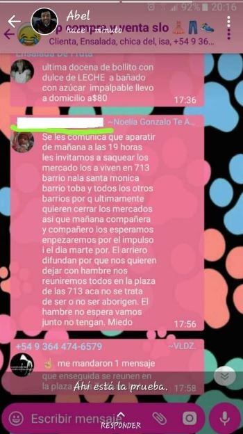 Las capturas de pantalla difundidas muestran un comunicado que se divulgó a través de Whatsapp y otras redes sociales como Facebook y Twitter. "Se les comunica que a partir de mañana (por el lunes) a las 19 horas los invitamos a saquear los mercados", comienza el mensaje, que alienta a personas de distintos barrios a robar mercadería de comercios locales.
