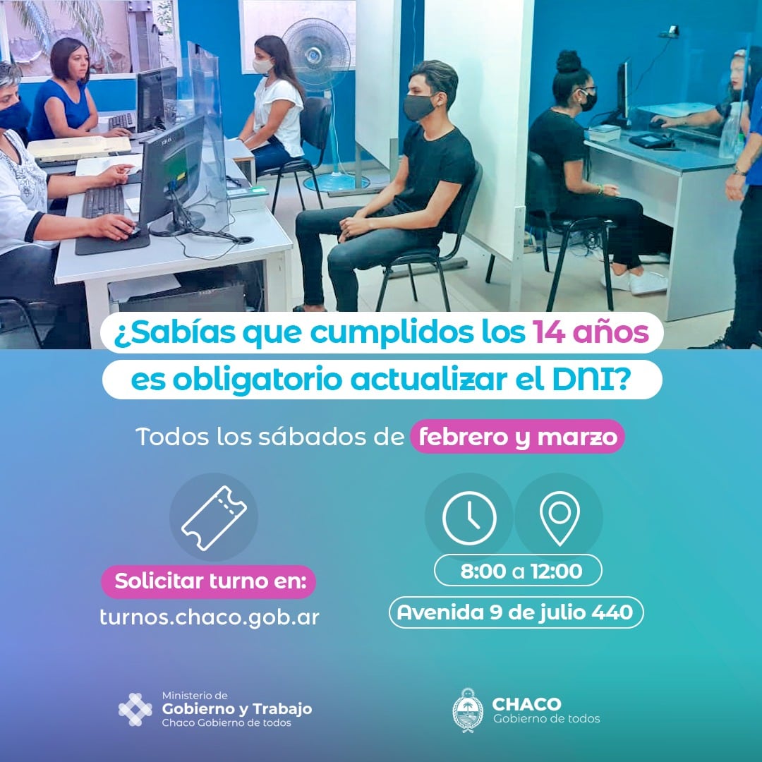 El Ministerio de Gobierno y Trabajo, a través de la Subsecretaría de Asuntos Registrales, informa que este sábado 20 de febrero, de 8 a 12 horas, se realizará un nuevo operativo de DNI Joven en el Registro Civil central, ubicado en avenida 9 de Julio 440 de la ciudad de Resistencia.