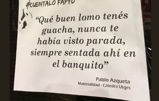 "Que buen lomo tenés guacha, nunca te había visto parada, siempre sentada ahí en el banquito", reza uno de los afiches que los estudiantes de la facultad decidieron colgar en los pasillos y que es endilgado puntualmente a Azqueta.