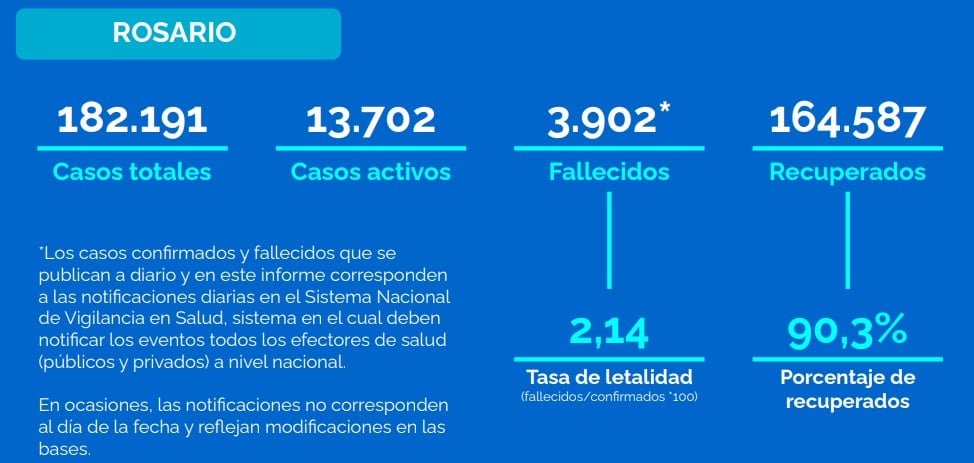 La ciudad registra un total de 182.191 contagios desde el inicio de la pandemia, de los cuales 164.587 personas se recuperaron de la enfermedad, registrando un porcentaje de recuperación del 90,3%. El total de fallecidos por Covid-19 asciende a 3.902, con una tasa de letalidad de 2,14.