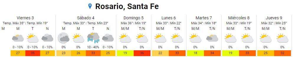 Mientras que para el domingo, ya no se registra inestabilidad, y la máxima vuelve a subir y ponerse en rojo: 36°C. Con el correr de los días, la máxima irá descendiendo, aunque siempre se mantendrá arriba de los 30°C.