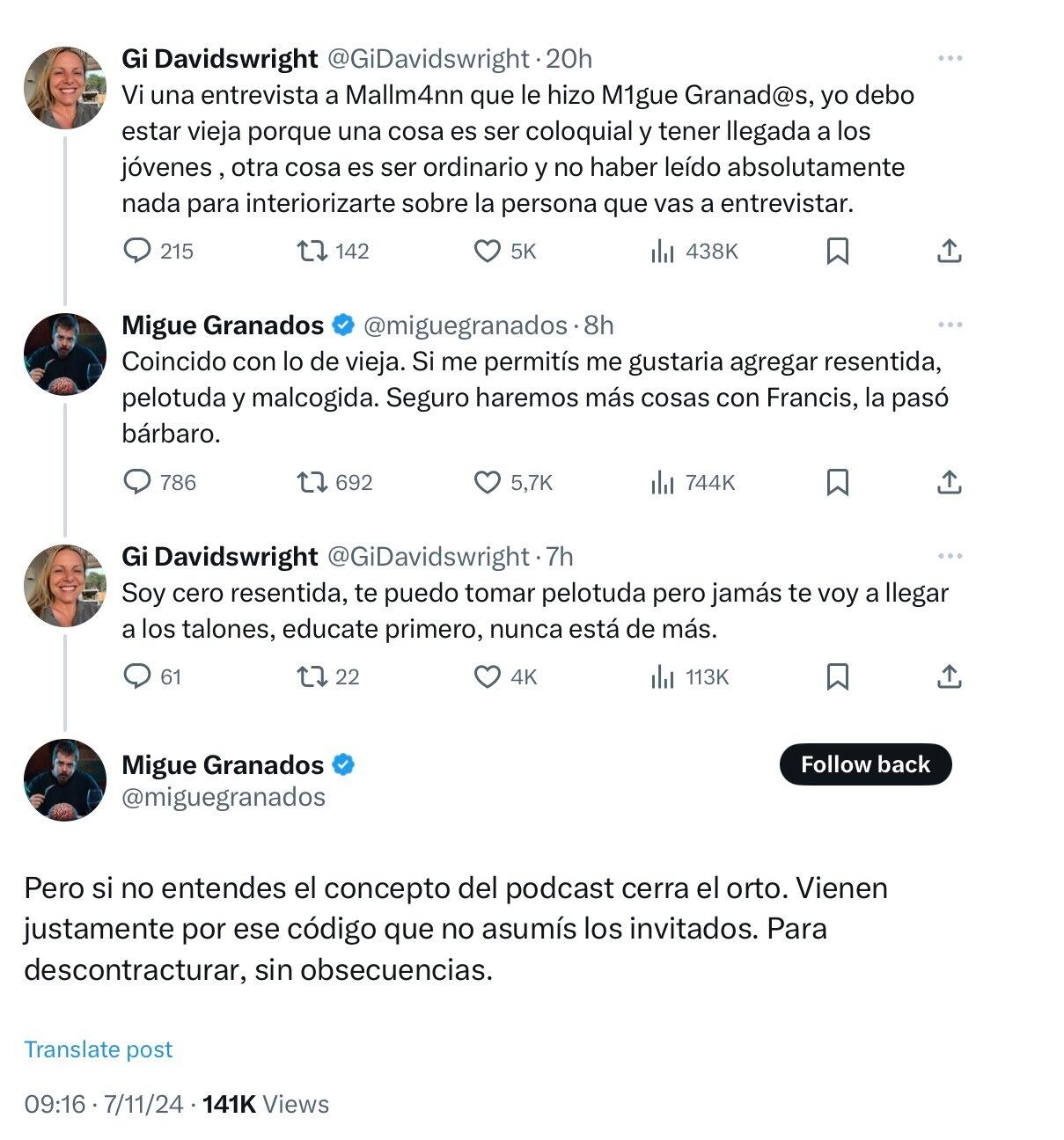 Lo que en algún momento fue una pelea con gran repercusión en X terminó con una reconciliación contundente. La arquitecta insultada por Migue Granados le agradeció el mensaje privado y añadió: ”Estuvimos hablando un rato sobre lo que pasó”.