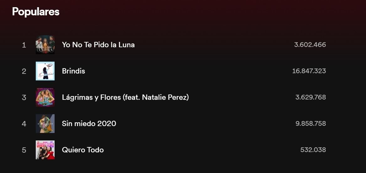 Según Spotify la versión de Yo no te pido la luna que la cantante hizo en colaboración con MYA está entre las preferidas del público, con más de 3 millones de reproducciones. Brindis ostenta más de 16 millones, situándose entre las más reproducidas, mientras que Sin Miedo le sigue con 9 millones de reproducciones.