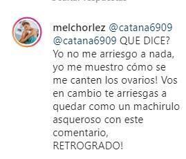 Yo me preguntó, se muestran así con la con... en primer plano y si le decís vos algo sos un acosador.... Decidan, o le gusta mostrar y te arriesgás a cualquier grosería o no te mostrás más así viejo. Es tasa minas (sic) no hay poronga que le venga bien...", escribió el seguidor de Melina.