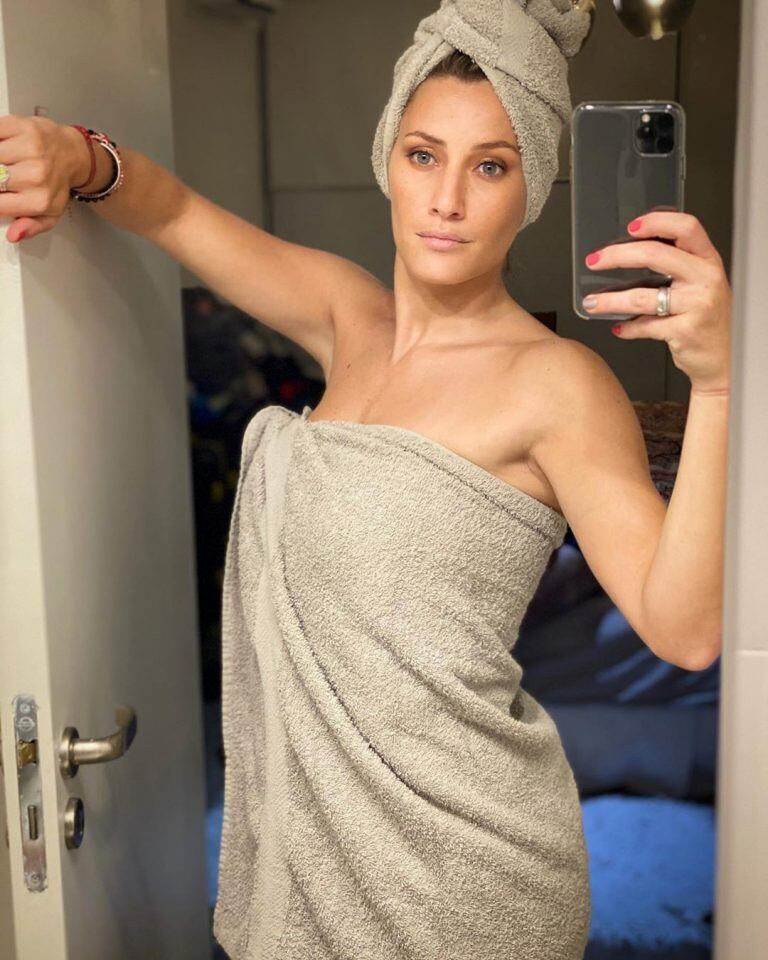 La rubia compartió una foto al natural, recién salida de la ducha, con un toallón alrededor de su cuerpo y otro cubriendo su cabello.