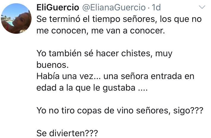 "Había una vez... una señora entrada en edad a la que le gustaba... Yo no tiro copas de vino señores, ¿sigo?", continuó el mensaje que publicó en Twitter. Eliana no dio más indicios sobre a quién iba dirigido el tweet y sobre quién se estaba refiriendo.