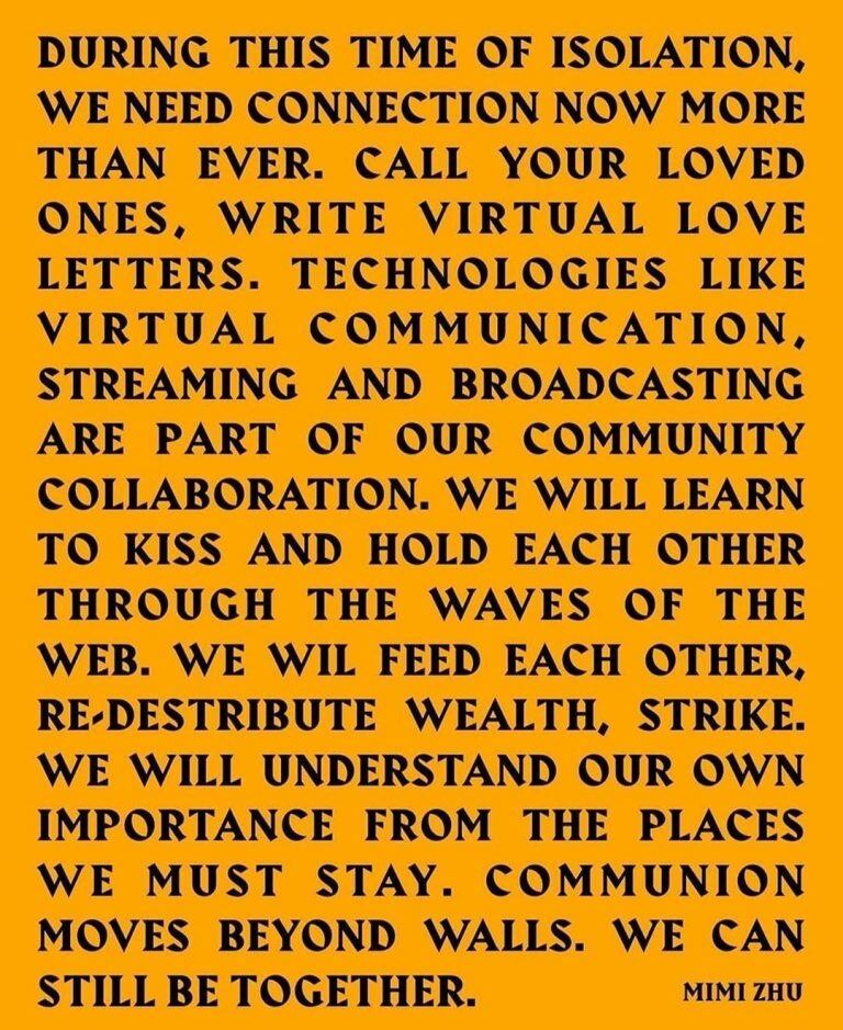 "Durante estos tiempos de aislamiento, necesitamos conectar más que nunca. Aprenderemos a besarnos y abrazarnos a través de las ondas de internet. Nos alimentaremos el uno al otro, redistribuiremos la riqueza, haremos huelga", afirma el mensaje.