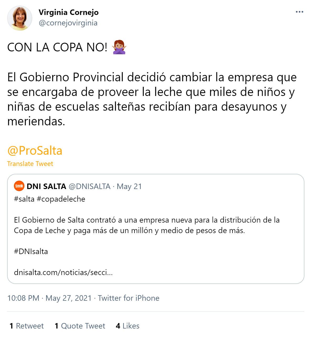 La Diputada Naiconal por Juntor por el Cambio, Virginia Cornejo compartió en su cuenta oficial de Twitter un rechazo por esta decisión del Gobierno Provincial, citando que esta maniobra fue “realizada sin licitación, de manera poco transparente” y que además, la empresa beneficiada está vinculada al exgobernador Juan Manuel Urtubey. Agregó que se seguirá el caso de cerca, porque “la copa de leche no puede ser un negocio.”