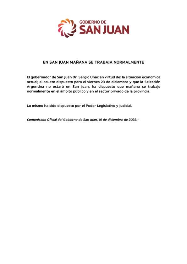 De acuerdo al texto oficial, la decisión de Uñac se da en virtud de “la situación económica actual; el asueto dispuesto para el 23 de diciembre y que la Selección Argentina no estará en San Juan”. Por esos motivos, “se ha dispuesto que mañana se trabaje normalmente en el ámbito público y en el sector privado de la provincia”.