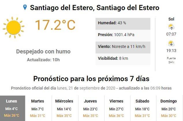 De acuerdo con la información brindada desde el Servicio Meteorológico Nacional, la temperatura mínima pronosticada para hoy, es de 8 grados, mientras que la máxima alcanzará los 26° en horas de la tarde. La humedad es del 43% y no se esperan precipitaciones aunque el viento permanecerá a lo largo de la jornada con ráfagas que podrían llegar a los 11 kilómetros por hora.