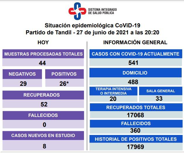 A través del último parte epidemiológico a cargo del Sistema Integrado de Salud Pública (SISP), indicaron que Tandil no logró reducir la cantidad de casos activos de coronavirus, que es actualmente 541. Por otra parte, advirtieron que en las últimas horas se registraron 26 nuevos contagios y ningún fallecido.