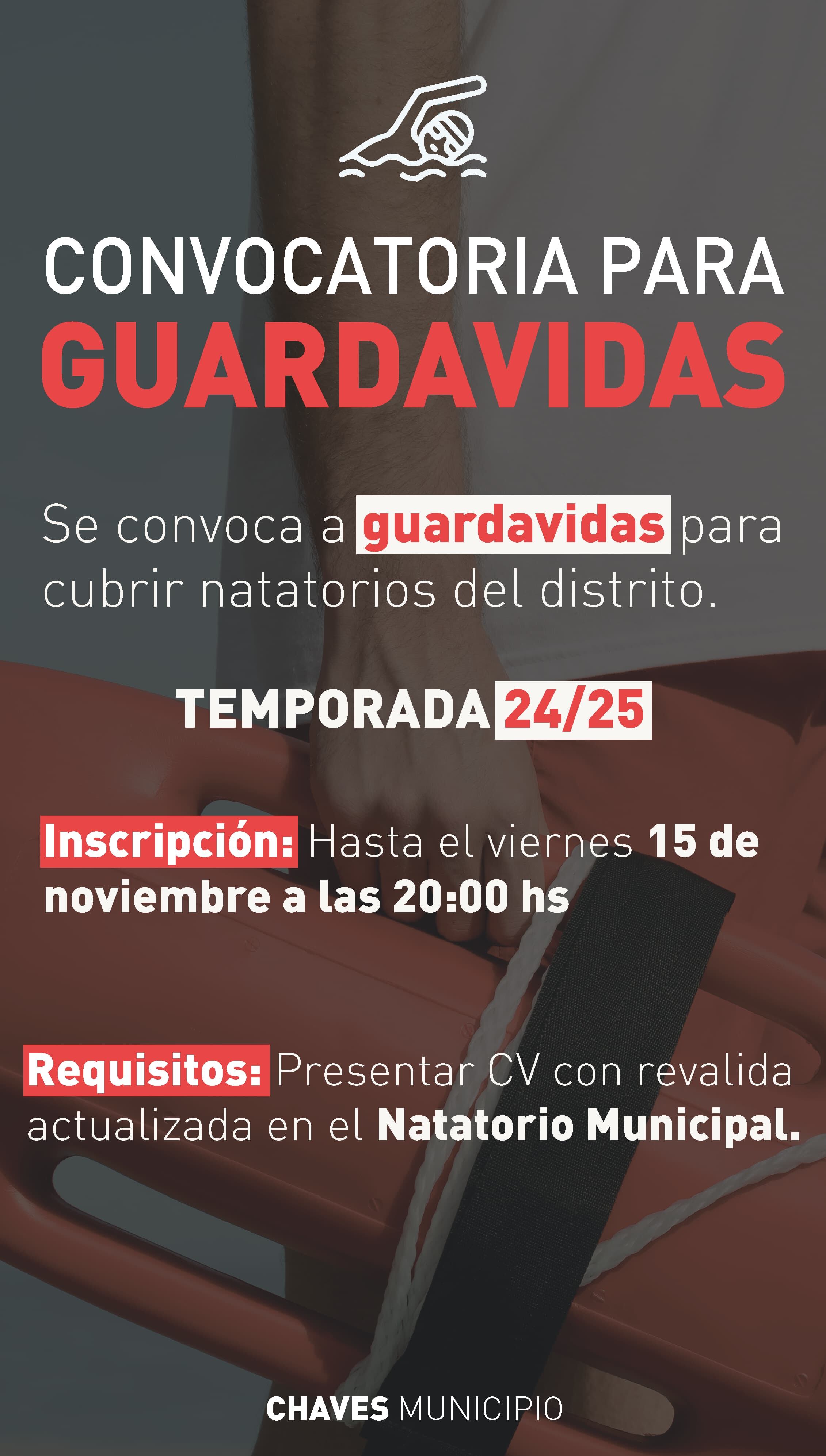 Desde el área de Deportes de Chaves Municipio expresaron: “La seguridad en nuestros espacios acuáticos es una prioridad para Chaves Municipio. Por eso, lanzamos esta convocatoria con el objetivo de contar con profesionales capacitados que puedan resguardar la integridad de todos los que disfrutan de nuestras instalaciones durante el verano. Invitamos a los guardavidas a unirse a esta temporada para brindar tranquilidad y seguridad a cada vecino y visitante que elija nuestros natatorios”.