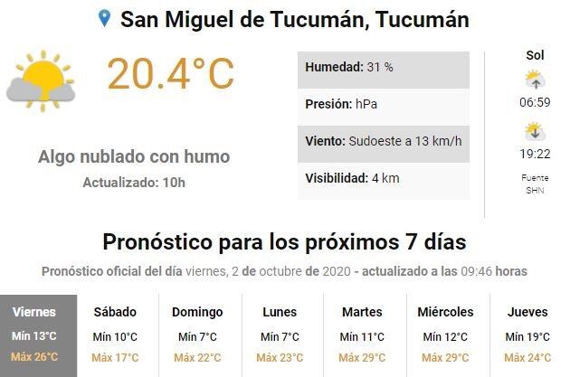 Desde el Servicio Meteorológico Nacional pronostican para hoy una mínima de 13 grados y una máxima que llegará a los 26°. La humedad es del 31% y no se anuncian precipitaciones.