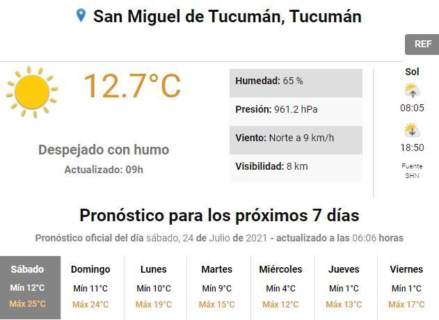 Desde el Servicio Meteorológico Nacional pronostican para hoy una mínima de 12 grados y una máxima que llegará a los 25°. La humedad es del 65% y no se anuncian precipitaciones.