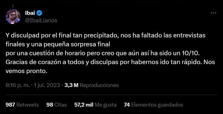 Al finalizar el evento, el streamer hizo su descargo sobre La Velada del Año 3 a través de Twitter. “Disculpad por el final tan precipitado, nos ha faltado las entrevistas finales y una pequeña sorpresa final por una cuestión de horario, pero creo que aun así ha sido un 10/10. Gracias de corazón a todos y disculpas por habernos ido tan rápido. Nos vemos pronto” escribió.