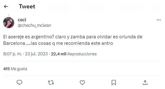 Con sus palabras, el autor del mensaje, dio a entender que la canción “Aserejé” era argentina. En seguida, muchos usuarios, en especial españoles, le respondieron de manera brusca dejando muy claro que era una canción española. Tal fue la magnitud del revuelo que la propia plataforma incorporó una aclaración: “Los lectores añadieron contexto que consideraron que tal vez otras personas quieran saber” y a continuación aparece un recorte de Wikipedia donde se explica el origen del sencillo.