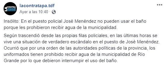 La Secretaría de Medios de la provincia desmiente de forma categórica la publicación de una información falsa, errónea o malintencionada por parte del portal La Contratapa TDF. Allí se asegura que el baño del puesto policial José Menéndez no funciona y que se dio instrucción de no recibir agua de parte del Municipio de Río Grande.