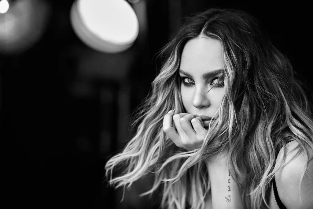 Para las fotografías lució dos looks total black. En el primero se la ve con un body negro de mangas largas y cuello polera pero sin nada abajo. Con un maquillaje súper natural, dejó su rubia cabellera al viento.