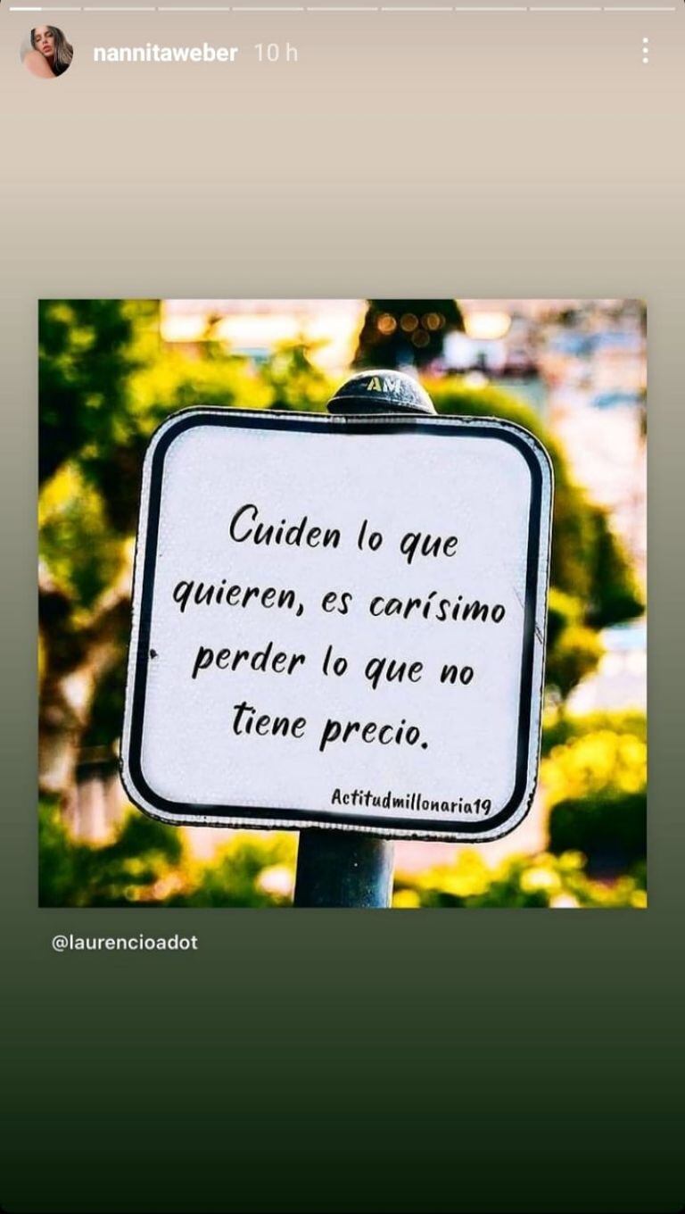 Además, Natalie compartió un misterioso mensaje que generó dudas entre sus seguidores: “Cuiden lo que quieren, es carísimo perder lo que no tiene precio”, aseguró.