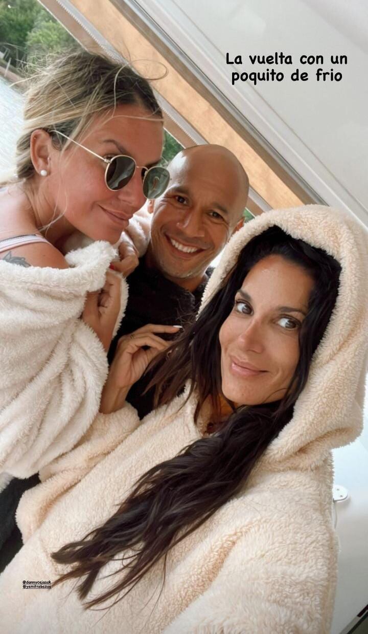 Silvina Escudero lleva el pelo atado y lentes de sol negros, muy típicos de ella. En el barco podemos ver a su marido, Federico, junto a amigos de ambos.