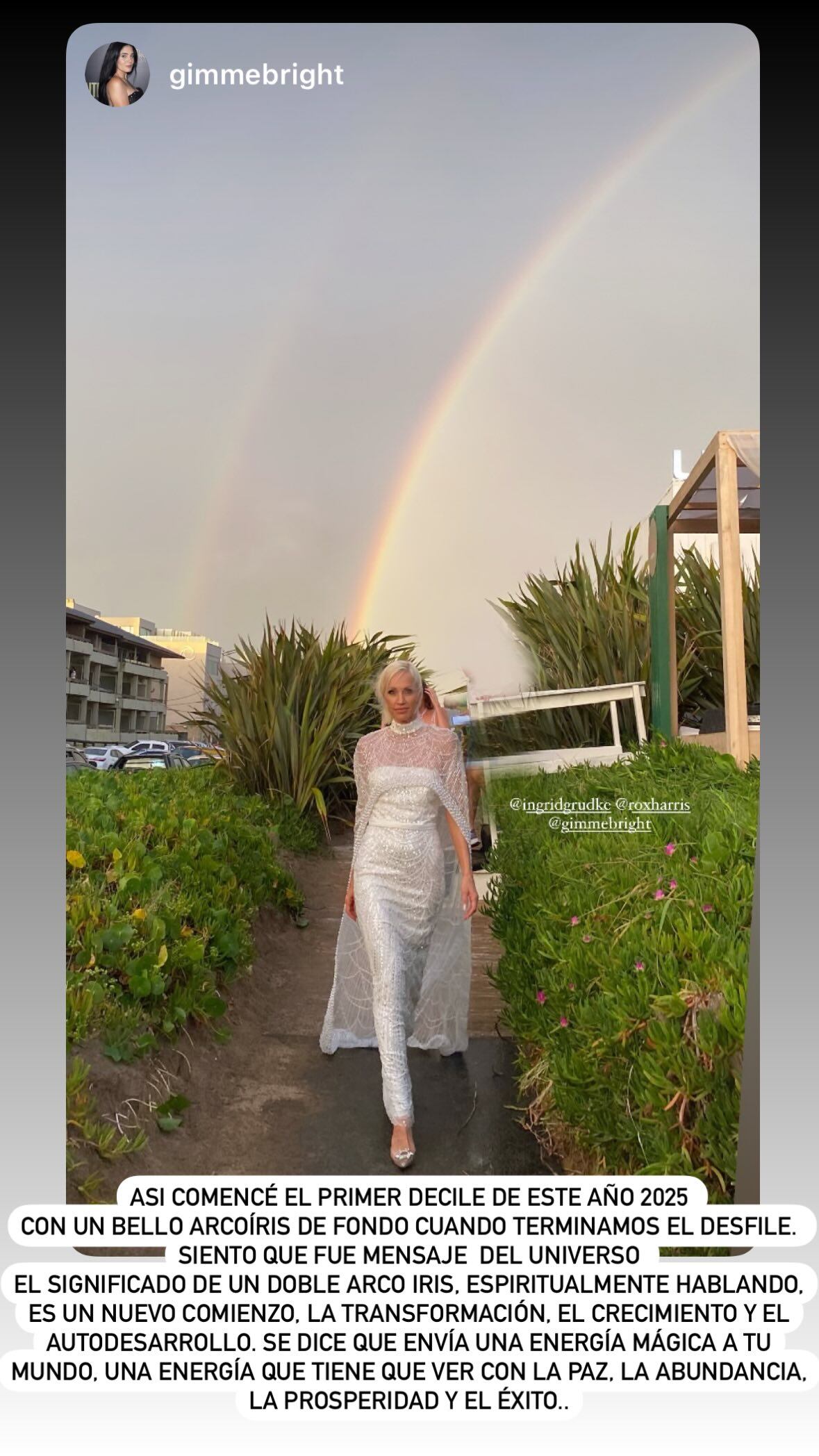 “Así comencé el primer desfile de este año 2025, con un bello arcoíris de fondo cuando terminamos el desfile. Siento que fue mensaje del universo el significado de un doble arco iris, espiritualmente hablando,es un nuevo comienzo, la transformación, el crecimiento y el autodesarrollo. Se dice que envía una energía mágica a tu mundo, una energía que tiene que ver con la paz, la abundancia, la prosperidad y el éxito”, escribió la modelo junto a al foto.