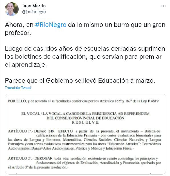 Juan Martín, legislador de la Provincia de Río Negro por Juntos por el Cambio, criticó el primer artículo de la resolución argumentando: “Luego de casi dos años de escuelas cerradas, suprimen los boletines de calificación, que servían para premiar el aprendizaje”.